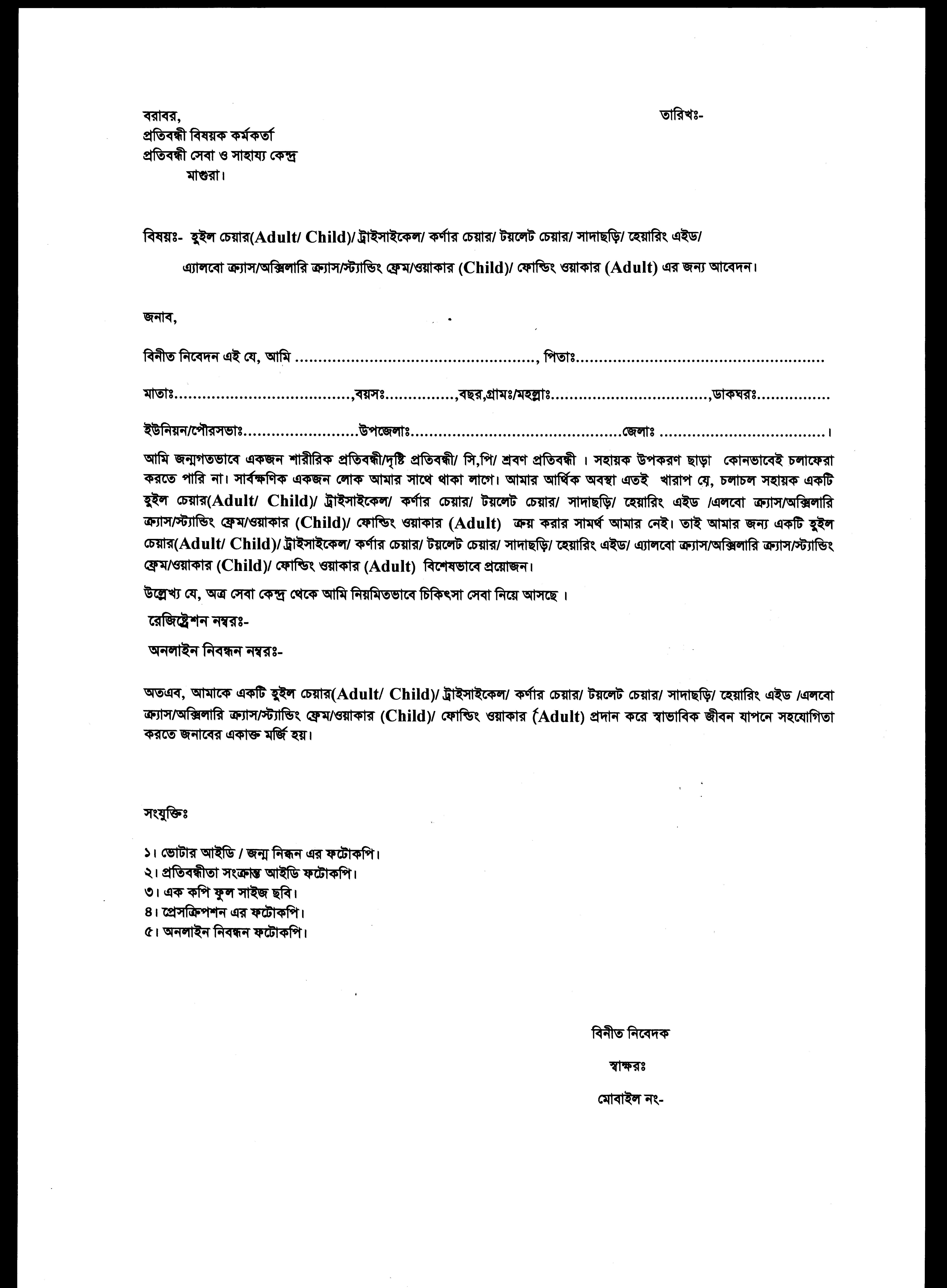 হুইল চেয়ারের আবেদন ফরম